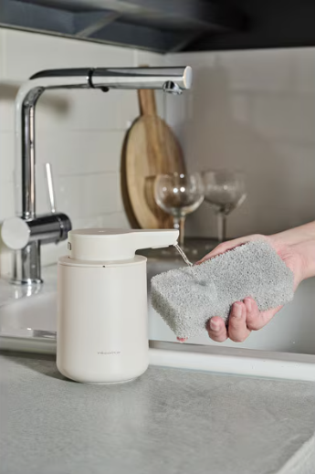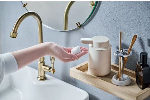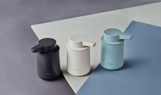 ⼿をかざすだけで、液体タイプと泡タイプのハンドソープや⾷器⽤洗剤が出てくる、オシャレなデザインの充電式ディスペンサー。